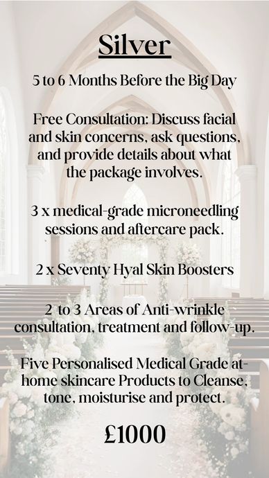 The Silver Package offers a beautifully balanced approach to pre-wedding skin prep, combining results-driven treatments with subtle enhancement. This package includes microneedling to refine texture and boost collagen, along with the Seventy Hyal skin booster for deep hydration and a healthy, dewy glow. Anti-wrinkle injections are also included to soften fine lines and create a refreshed, smooth appearance. Ideal for brides seeking a natural yet noticeable radiance, the Silver Package ensures your skin looks radiant and confident — ready for every close-up on your special day.
